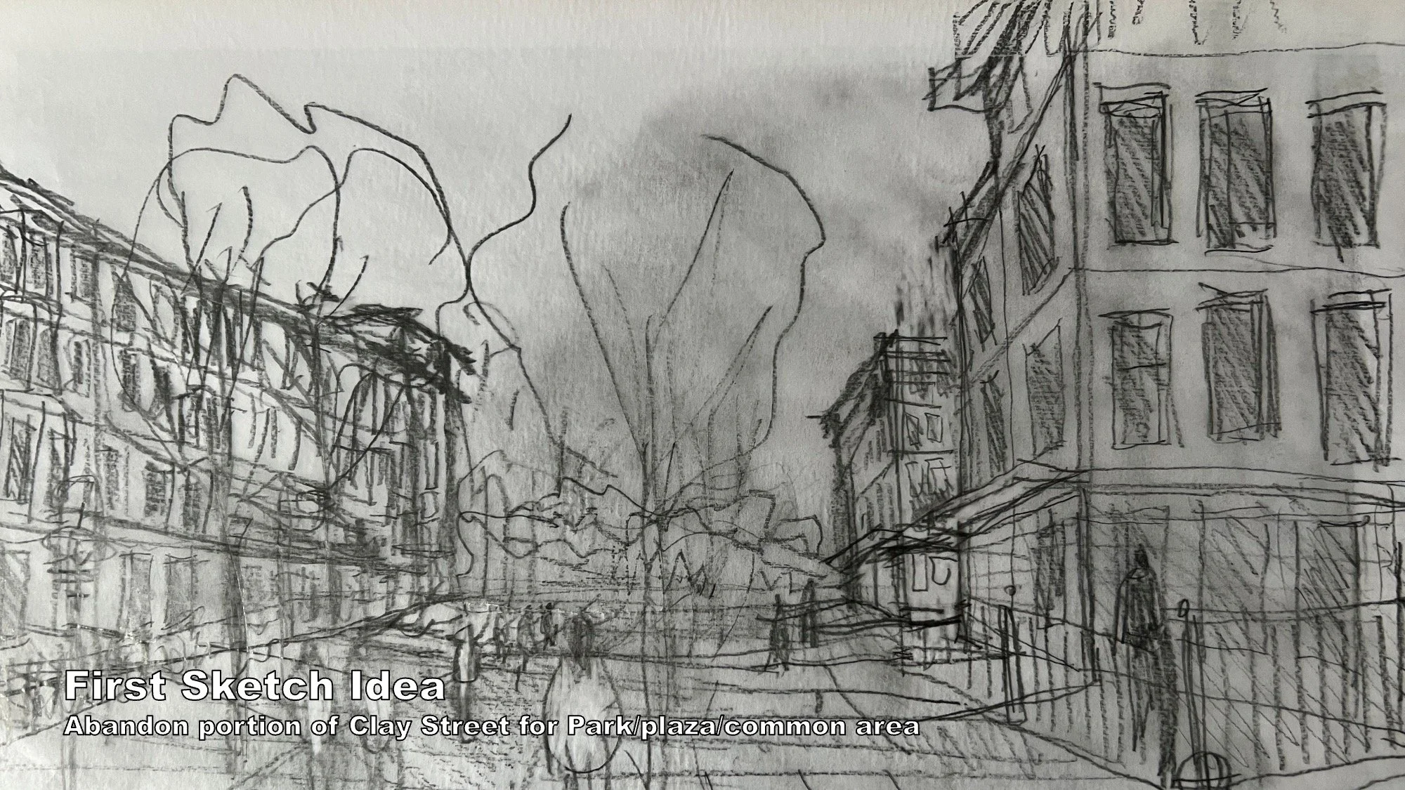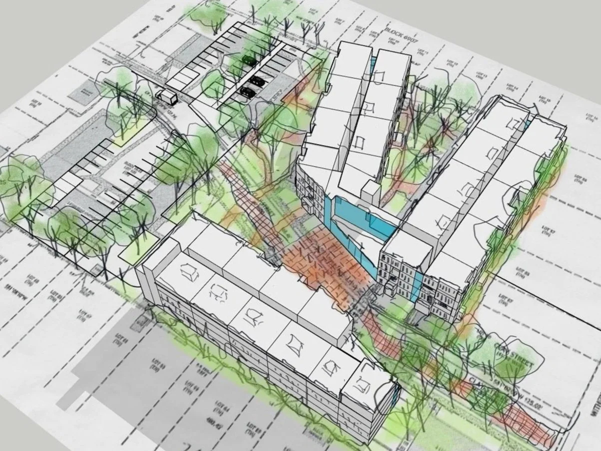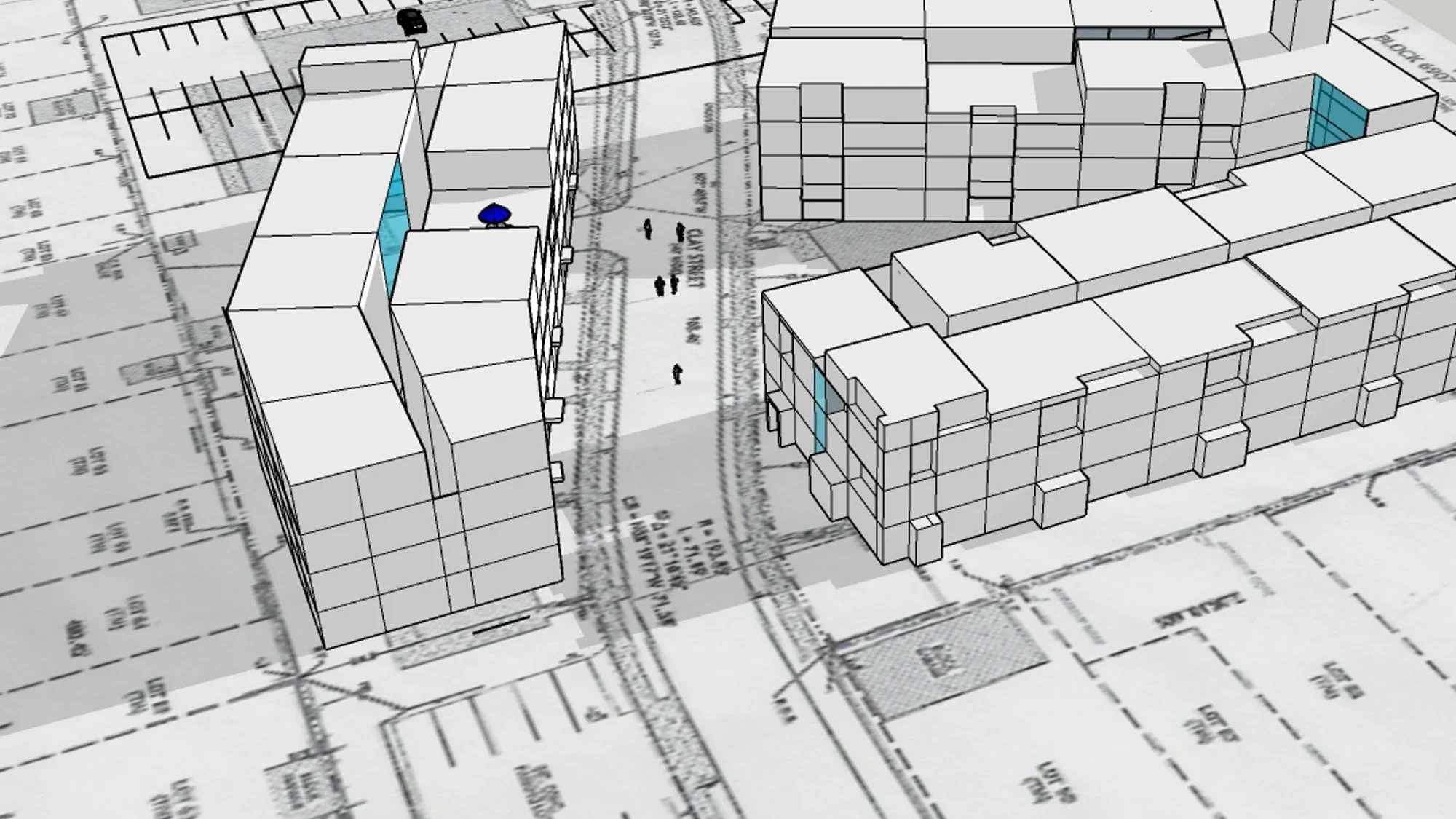 Current Aerial (Google Earth) Courtyard with turf and concrete turtle Limited Parking Sketch (Abandon street for park plaza) Option A Option B 3D Massing Option B Sketch Rendered Massing Option C (Plaza ideas pictures) Option D (Sunshine for all) Option D Sketch Option D Massing Option D 3D Massing